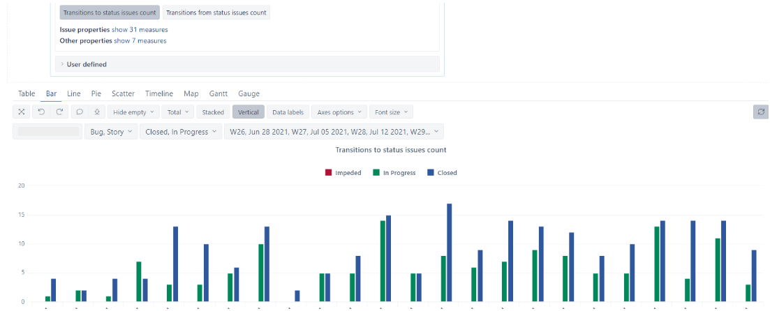 I’ve set up a report to count “In Progress” and “Closed” items by week in eazyBI based on the measure “Transitions to status issues count”.