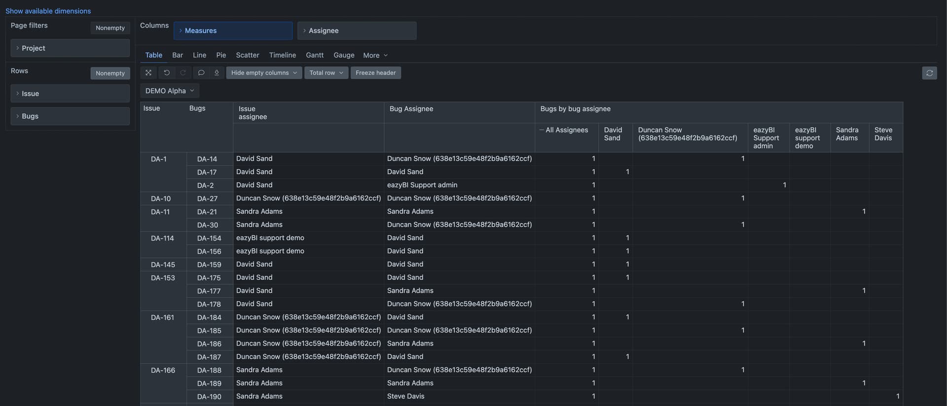 @sn1ffer The solution above describes how the dimension “Assignee” works as a filter to get report rows by the “Bug Assignee” field.