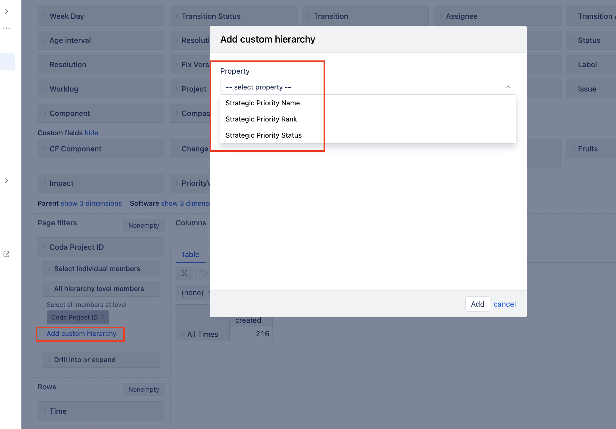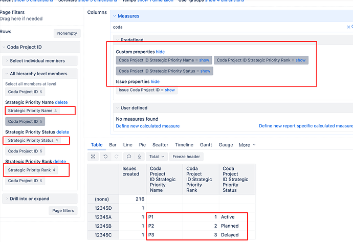 Add a new dimension (Strategic Priority) with properties like Strategy Name, Rank, and Status, and link it to Coda Project ID inside the Issues cube.