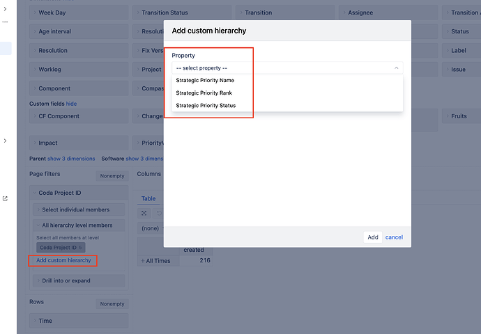 When the fields are added as Custom hiearchy, you can use the Coda Project ID dimension and use that as a filter based on these additional hierarchies.