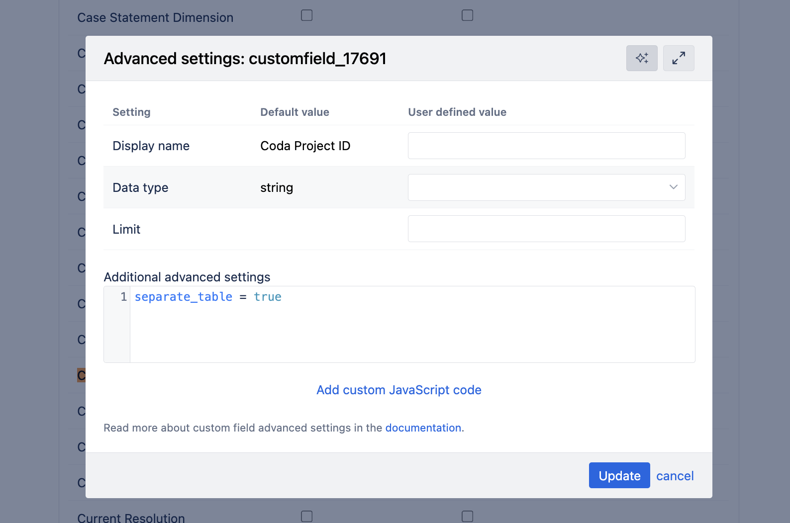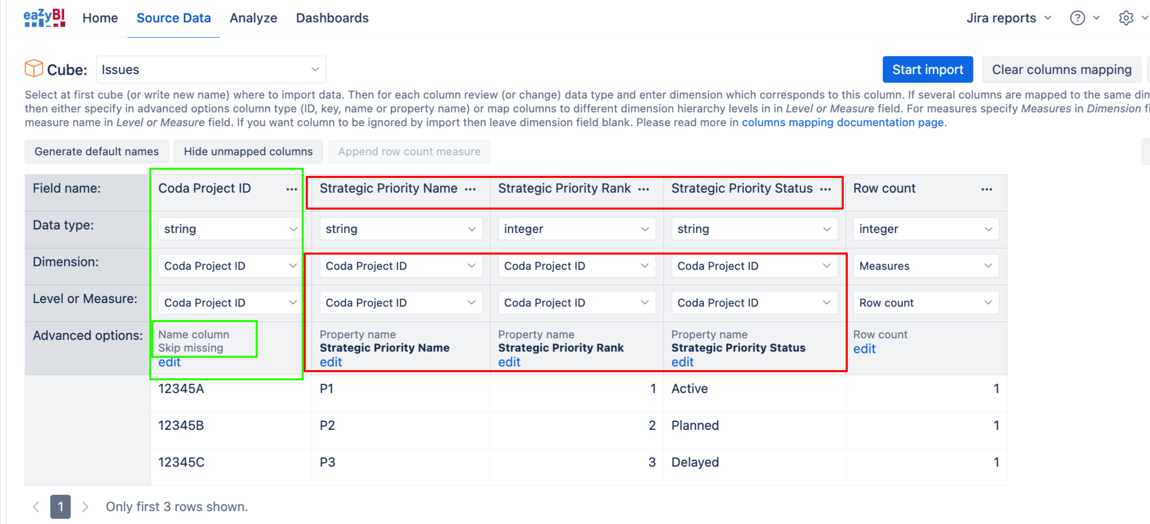 Important note, the mapping will only be available for the Coda Project ID dimension if you have added separate_table = true parameter in eazyBI import options for this field and imported into your Issues Cube.