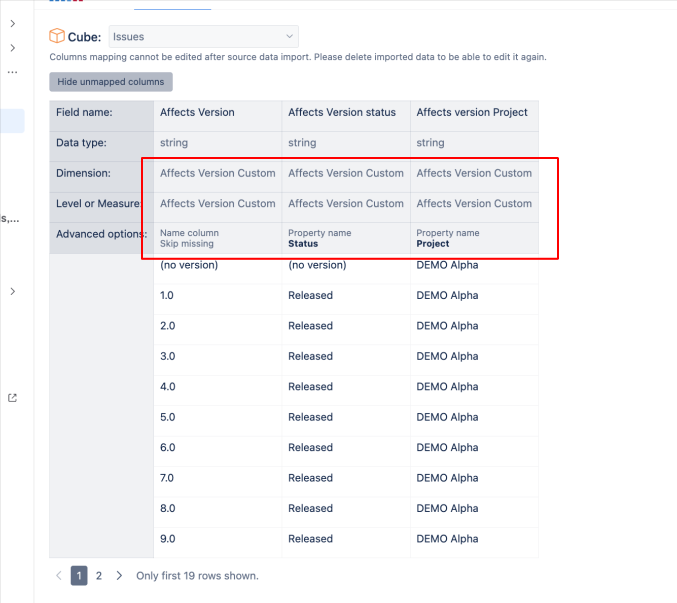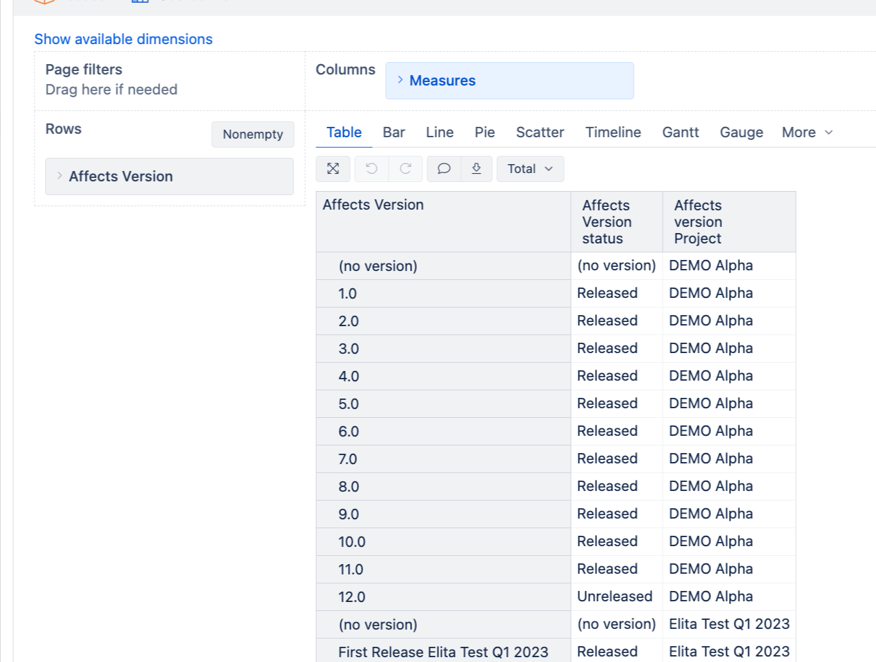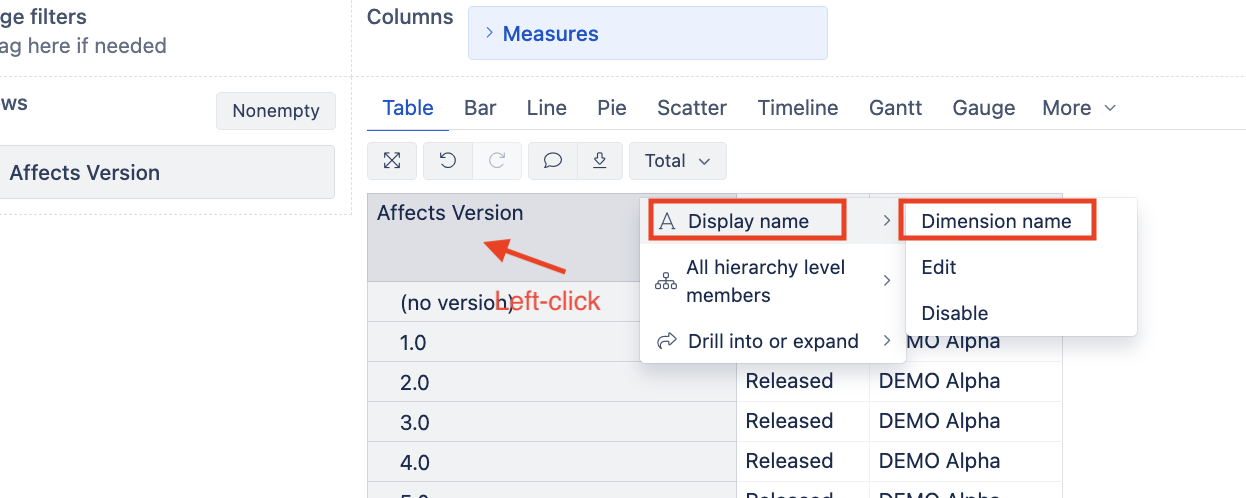 First Column Dimension should be your Affects Version Custom dimension. Make sure you enable skip missing and that it is a name column