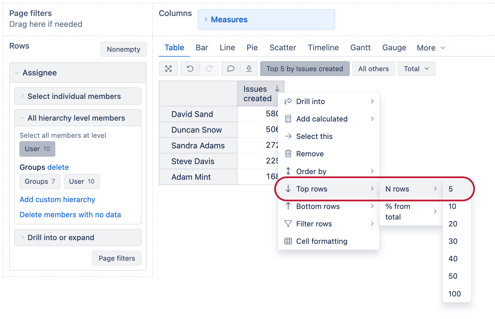 You can select the “Issues created” or “Issues resolved” measure, click on the column header, and choose the “Top rows” option to show the “Top 5” or “Top 10” Software by issue count.