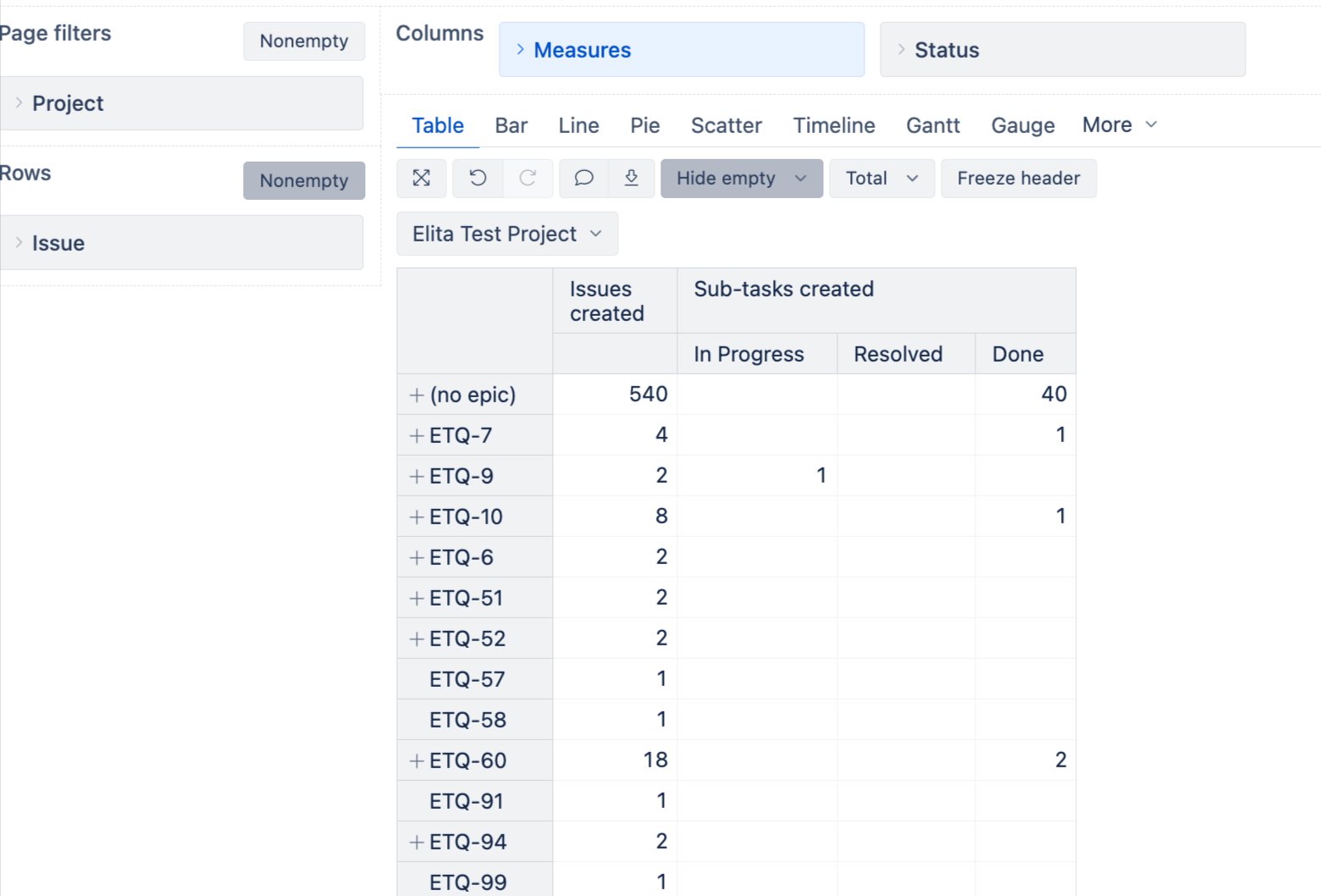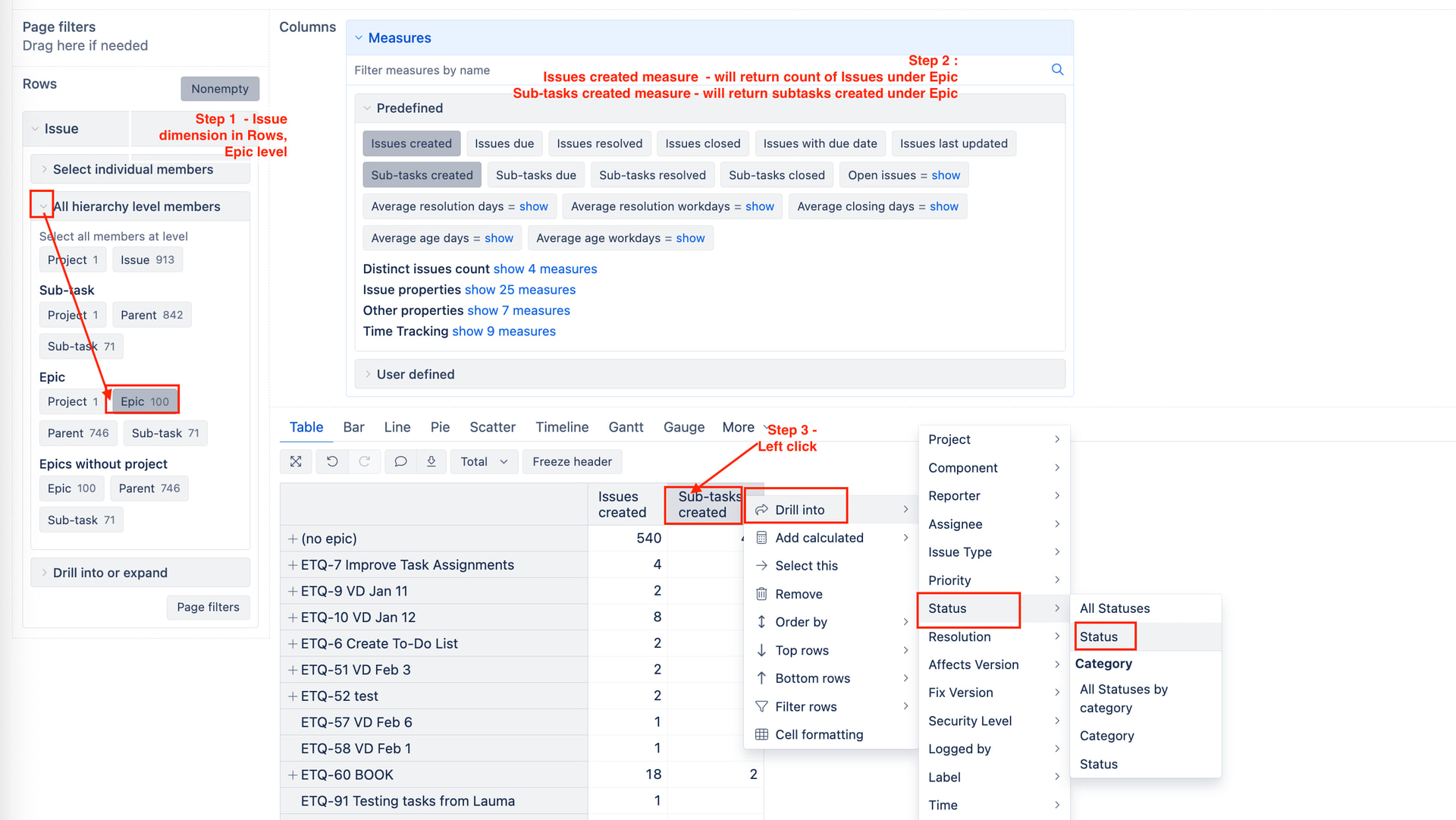 EPICS —> Stories –> SubTasks (at row level) and display status of subtask in columns