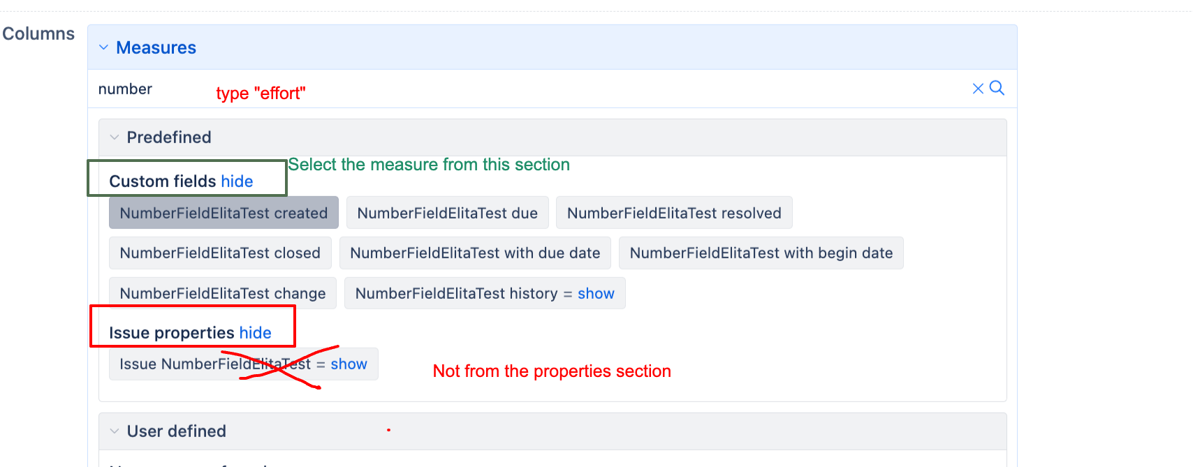 Add your “Effort” measure to Columns. Please note! Do not add the property (Issue Effort). Instead, add the measure “Effort created ” as only the measure will aggregate the values. If you do not see such a measure available, make sure your Effort field is selected to be imported as a measure.
