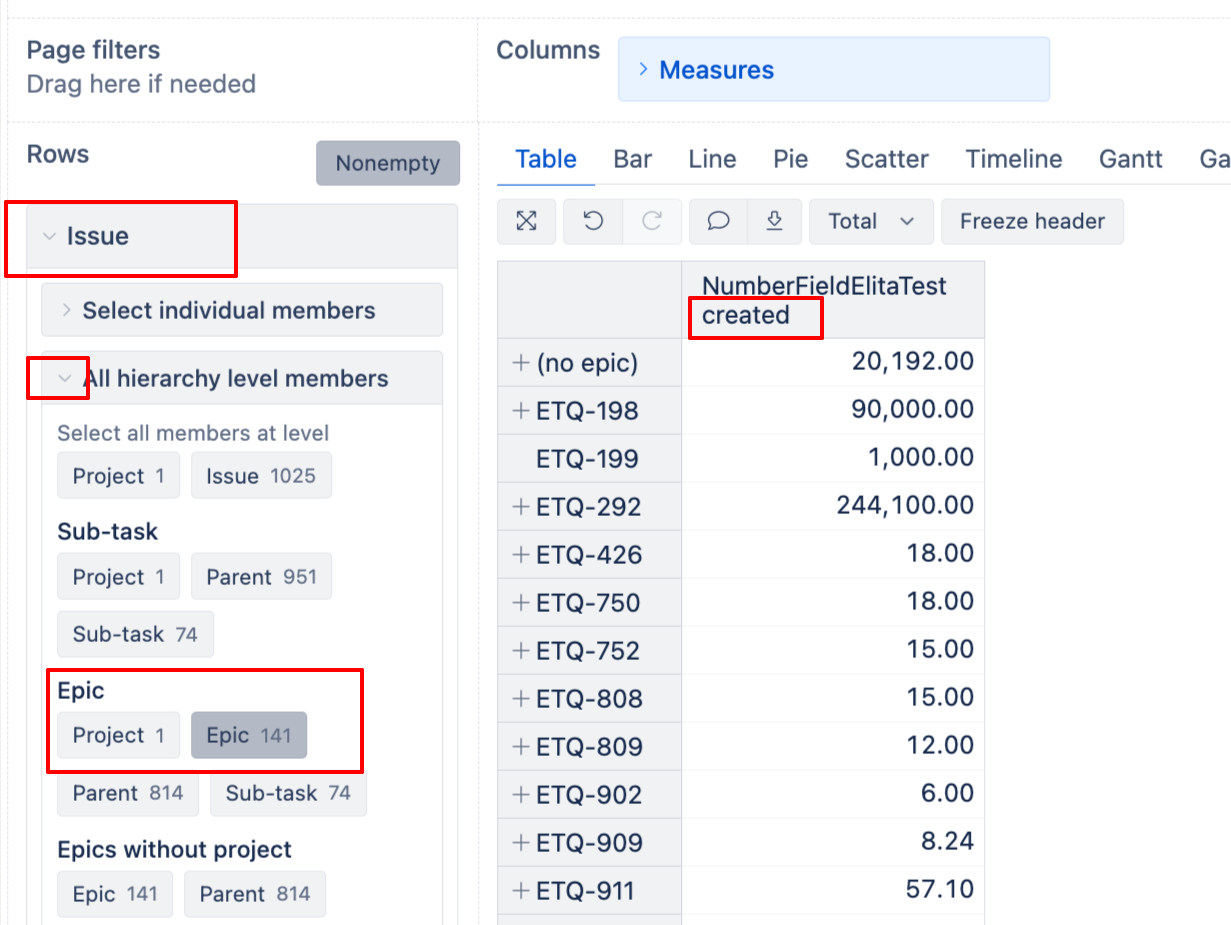 Add the Issue dimension to Rows and select the Epic hierarchy.