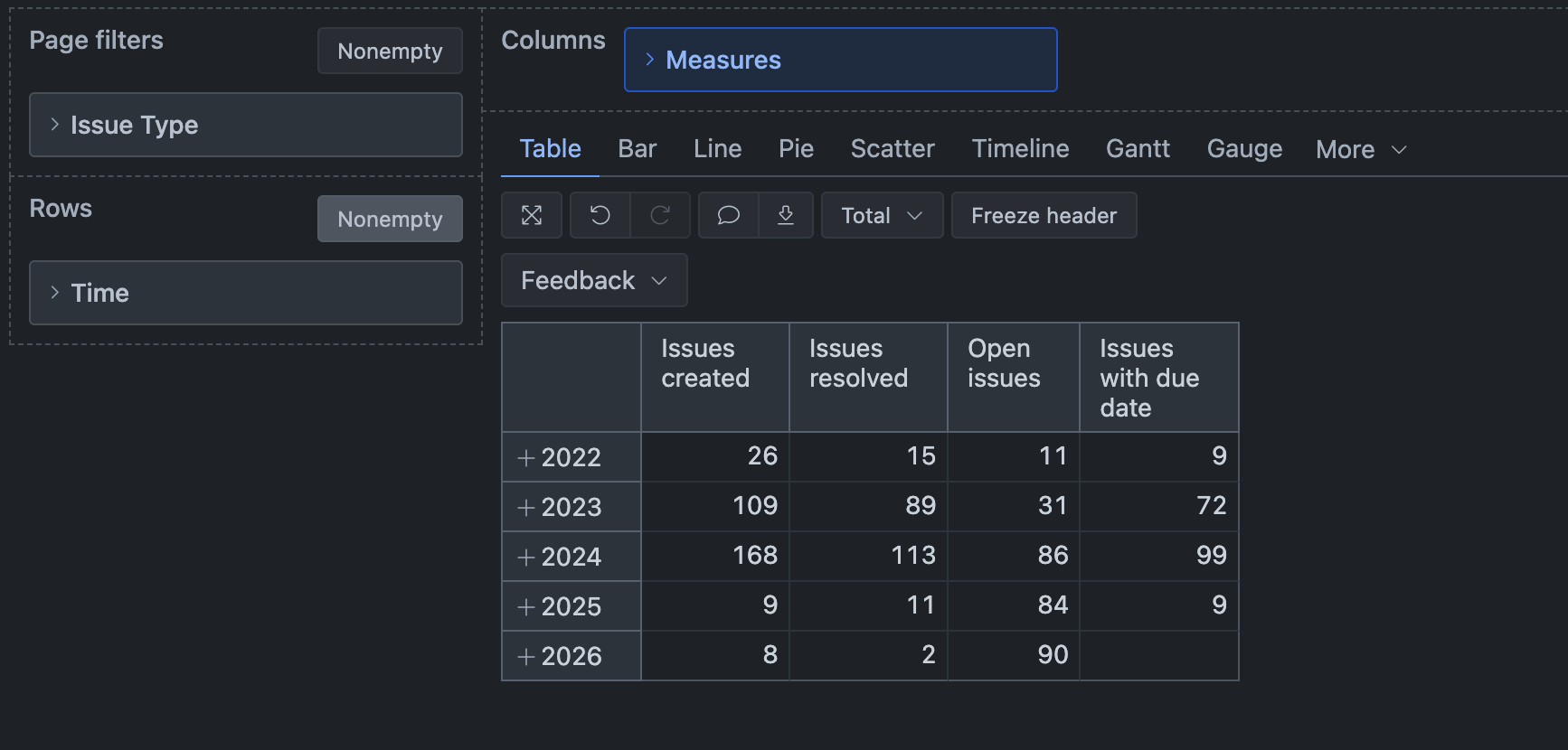 Suppose you want a report about Feedback issues. Start with a simple report that filters data by Issue type 'Feedback’ and represents Time periods on rows.