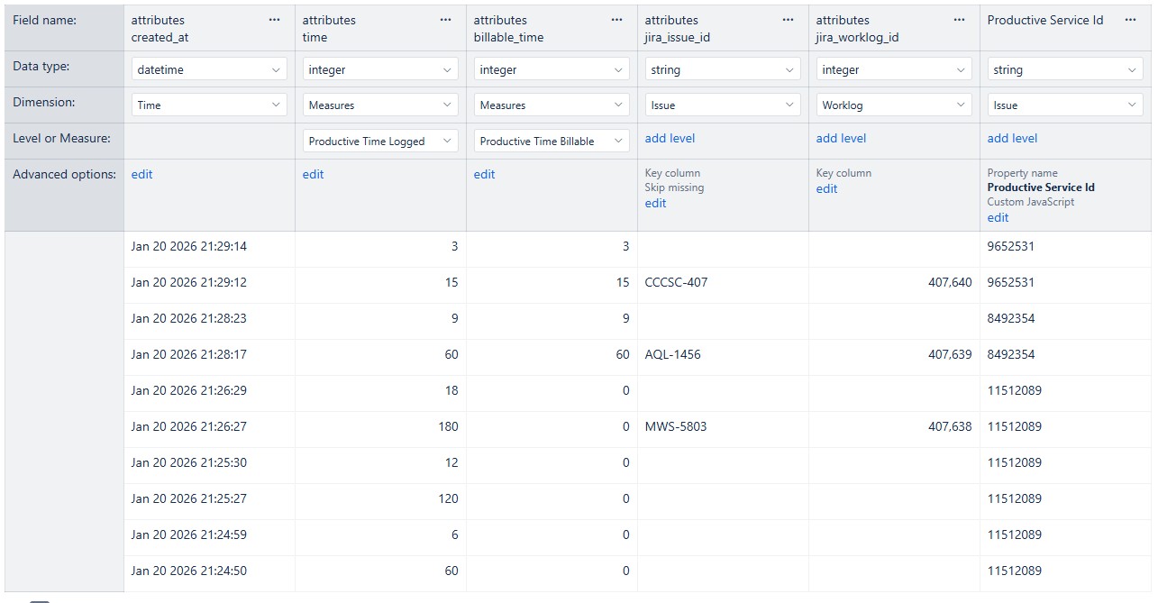 What im trying to do is Import ALL of these time sheet entries. I want to be able to report by Service.. and see time which both map to a Jira issue and Time which doesnt map to a jira issue. Therefore for a service i could see the break down of Jira Related work and non jira related work. I cant figure out the best approach for this. Technically there is a Budget service i could call in Productive, but a budget maps to a service so i need to solve this first step. Im looking for guidance on the bet way to do this, it seems like it should be a common pattern and id like to report by service to see the list of issues etc.. and hours logged in jira and outside of jira. Im clearly missing something as it feels a basic thing for me to solve yet i cant create a custom dimension called Service or Budget which is what i would have thought id need to do… Help ![]()