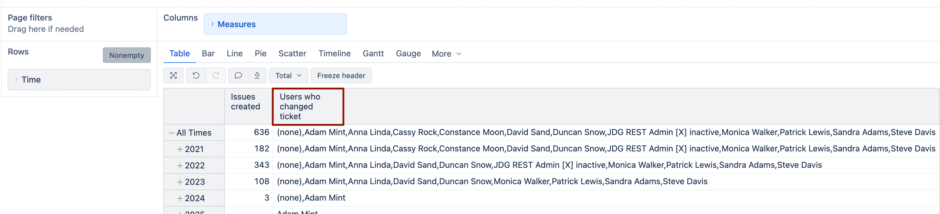 It would let you see the list of users (CSV string) who made the changes for those fields that eazyBI is able to pull with history in the data cube.