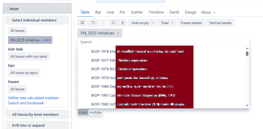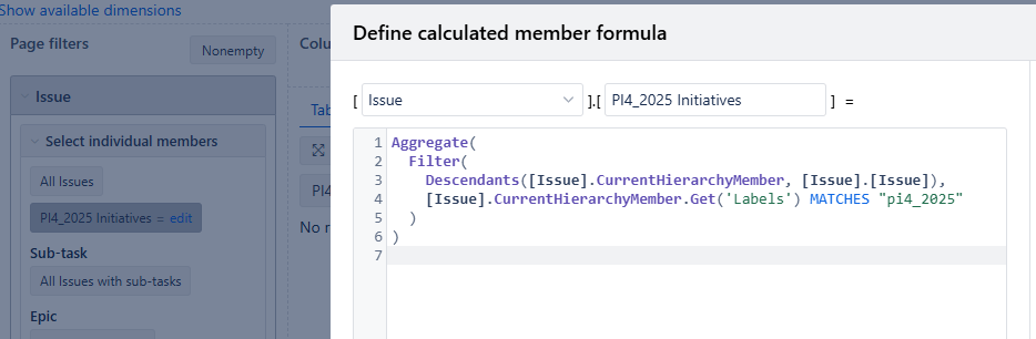 To test this, I created the following calculated measure. However, this measure is currently populating the Issue filter with Stories that have the specified label, rather than Initiatives. I’m unable to determine how to adjust the logic so that the filter is populated with Initiatives that have the label instead of Stories.