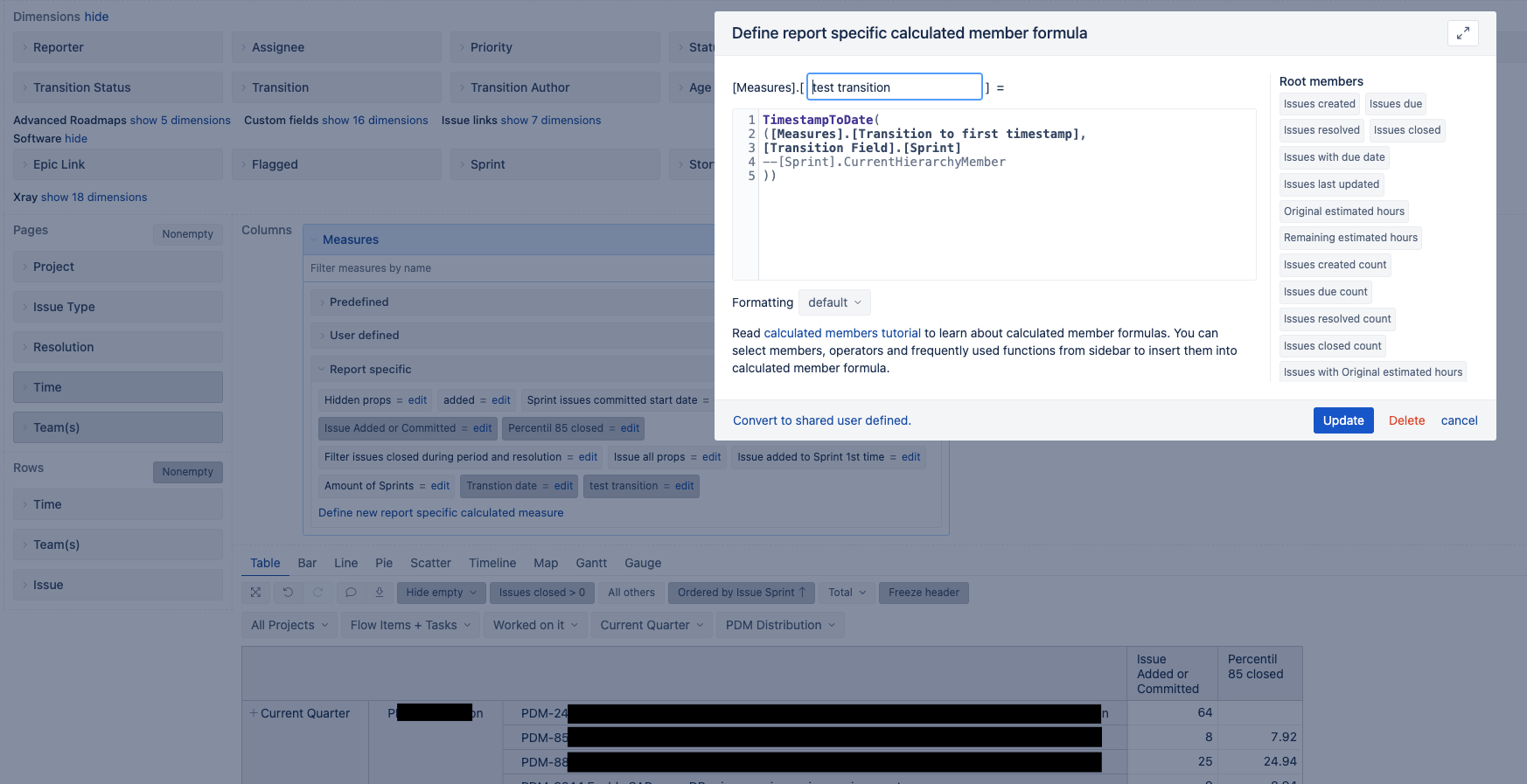 You can see below what is in the report (for debugging options I have selected the Issue dimension although it will be out of the report), so the idea is it have only the Percentile formula at columns and for rows Team & Time.