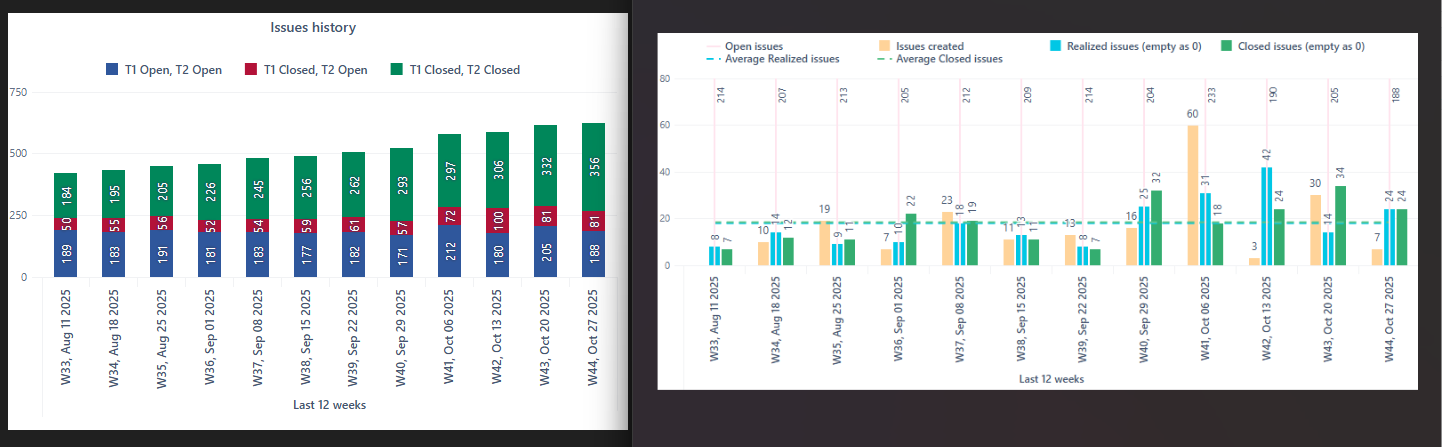 Realized issues ←→ T1 Closed/T2 Open => 3 issues difference between CW42-CW43 but the Realized issues shows 12 instead