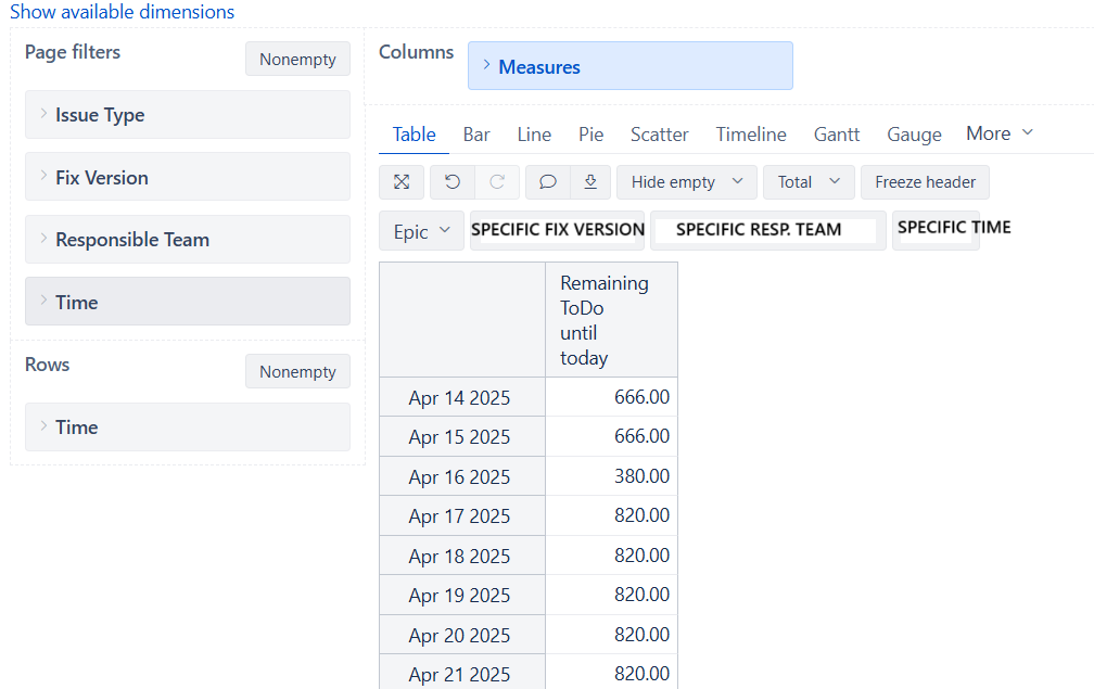 I’ve tried several times, but I still cannot include the Remaining Estimated Hours History for Linked Issues (Issues in Epic)… The linked issues do not have any of those filters. Looks like my filters (Fix Version, Issue Type) are also filtering out the linked issues from the report (as the linked issues do not met any of the selected filters). I’ve tried to remove the issue type and fix version filters and using the calculated measure below, but it’s extremely slow and doesn’t work anyway (I didn’t even add the responsible team filters as this is not working anyway…).