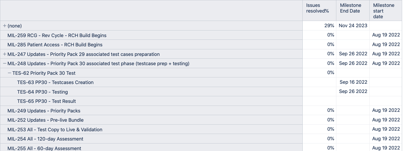 I’m trying to create a Gantt chart report that will show the start and due date of an issue type named “Milestone” which a higher level than “Epic”, it should show the first “Start date” of child issue and the last “Due date” of child issues. if there is no data in the child issue it should be empty.