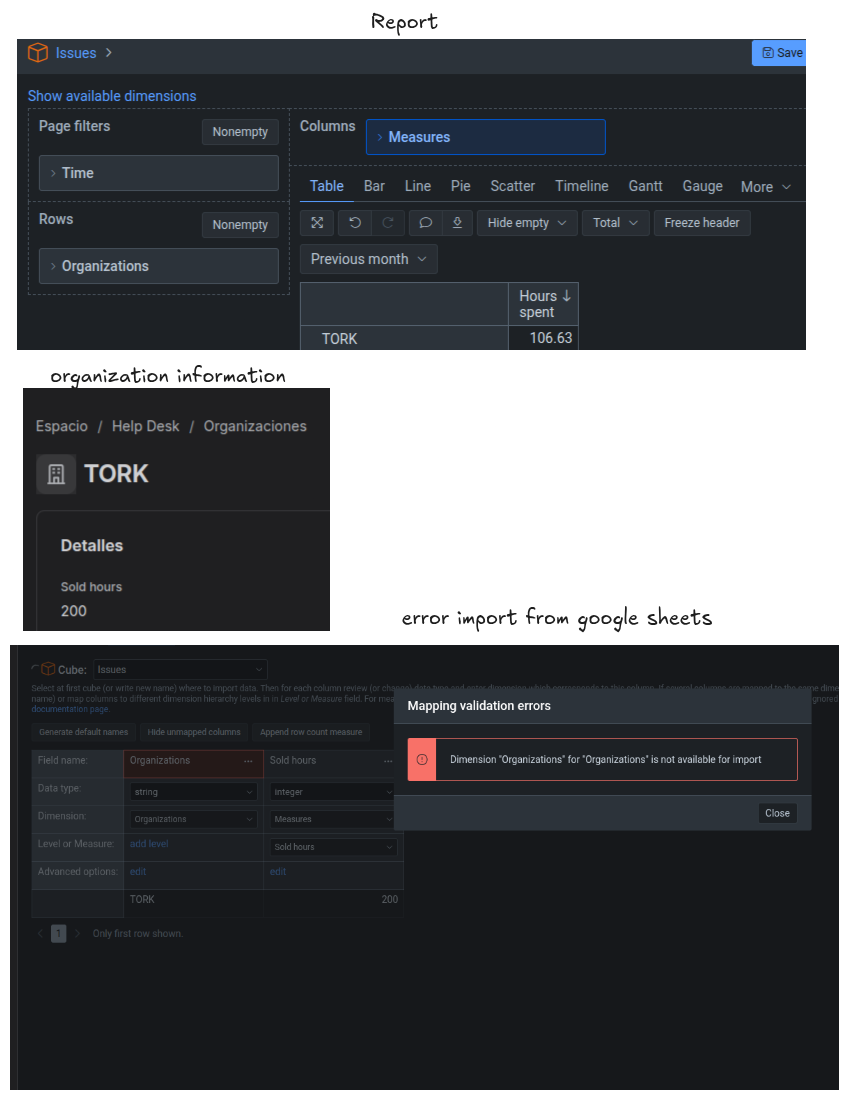 We save the hours sold in the organization information, but we are not sure how to display them in the report. We tried importing them from a Google spreadsheet to the Issues cube, but it is not possible to create new dimensions. Nor is it possible to modify the Organization dimension to be able to use that data.